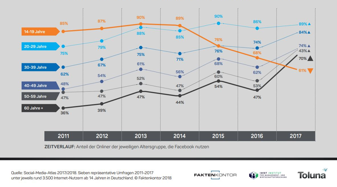 Diese Konversation zeigt zwei Dinge: Erstens: Ich habe komische Freunde und zweitens: WhatsApp und v.a. WhatsApp-Gruppen sind der gängige Weg der digitalen Kommunikation für junge Menschen in Deutschland. Wer Facebook betrachtet, wird etwas anderes vorfinden. Auf der einen Seite verändert sich die Art des Inhalts auf Facebook seit einigen Jahren stark. Der frühere nutzergenerierte Inhalt mit Urlaubsfotos ist einem Fluss an offiziellen Unternehmensseiten, Like Pages und Social Media Influencern gewichen, in dem nur noch geliket und kommentiert, vielleicht geteilt wird. Facebook ist ein Kommunikationsinstrument für Unternehmen und es gehört zum guten Ton einer Social Media-Abteilung, Facebook-Seiten zu betreiben und darüber die Kunden zu erreichen. Sogar Großeltern nutzen Facebook.